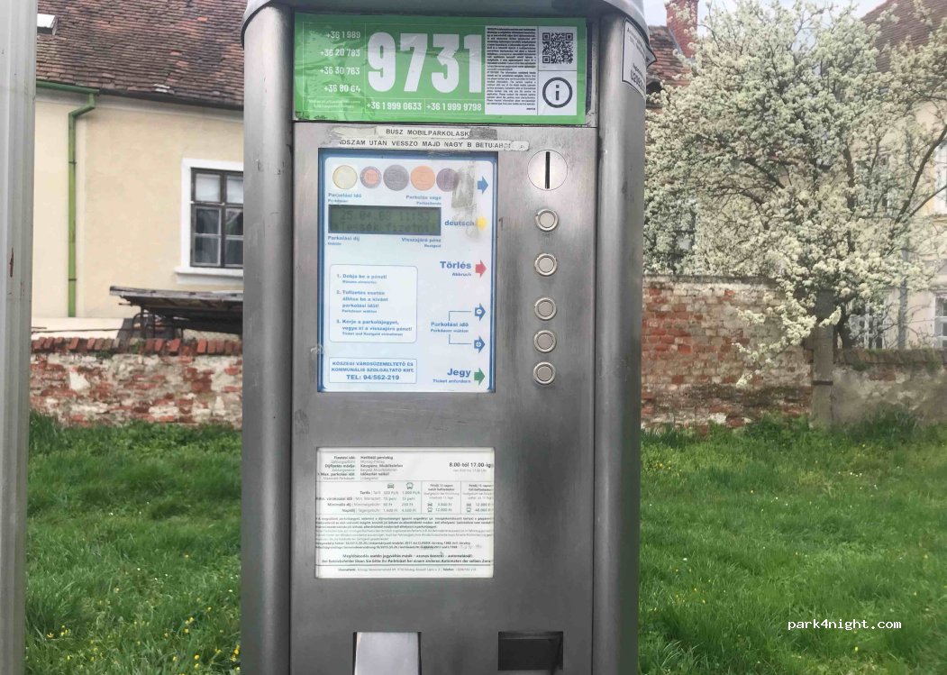 Perfekter Ausgangspunkt für Sightseeing der schönen Stadt. Parkautomat mit Münzen (1 Stunde für 340 Forint), online ist die Zahlung auch möglich. Zwei „lange“ Parkplätze vorhanden. 1 Stern Abzug, da ich es nicht für eine Übernachtung empfehlen würde. Tipp: Dafür besser zum Campingplatz in Csepreg (15km) weiter fahren.