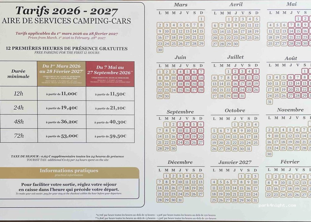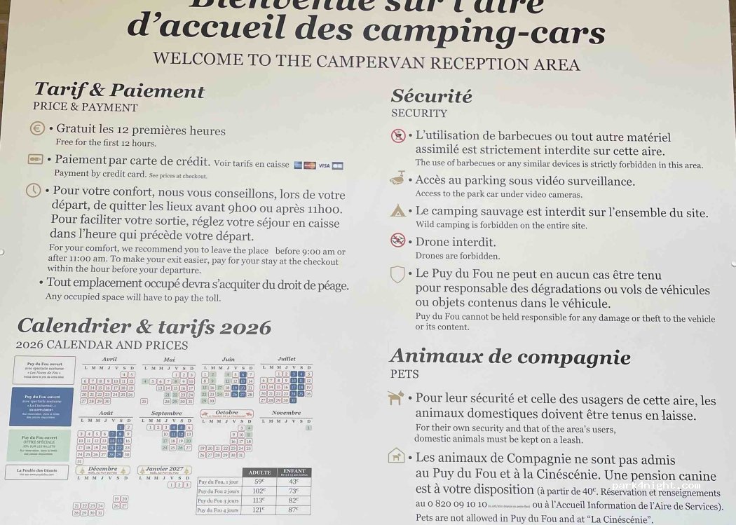 Gratuit en journée idéal pour aller au Puy du Fou, payant entre 1h et 7h du matin (6 €). On paie à la sortie, toilettes et lavabos publiques gratuits (étroits), prises électricité 1 jeton/12h mais rares et très prisées. vidange et remplissage payant un ou deux jetons. Nous n'y passerons certainement pas la nuit, beaucoup de monde et ne parait pas très calme. À moins d'aller au fond du parking ou il y a moins de monde.