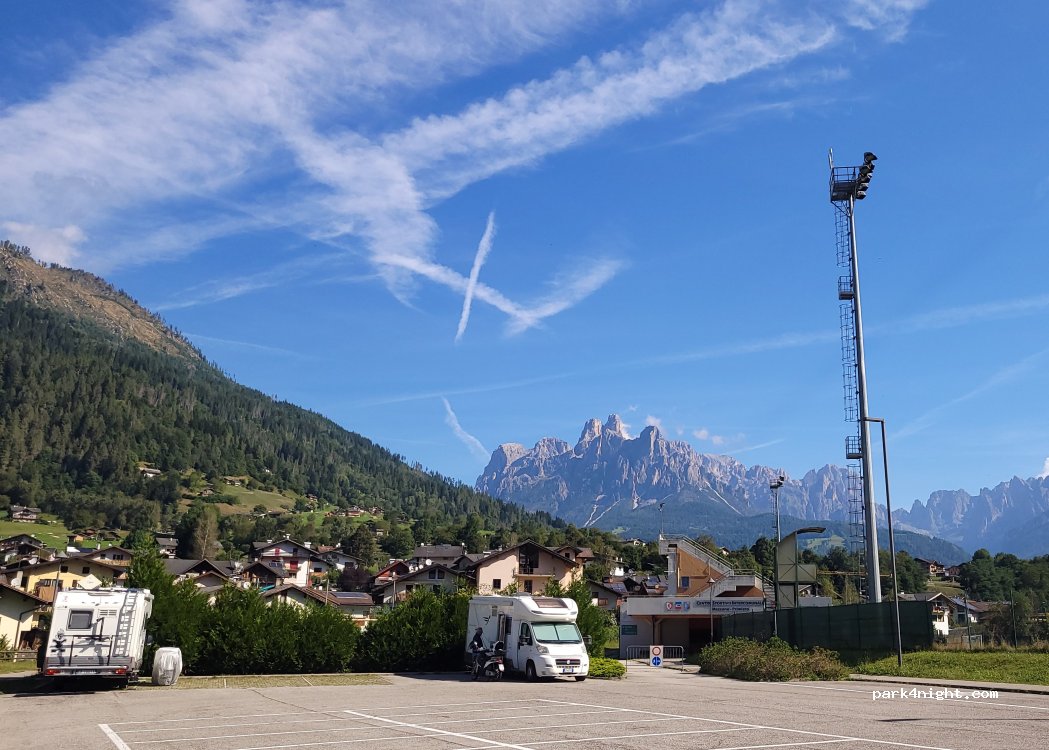 ottimo parcheggio ma attenzione a non fuoriuscire fuori dalle strisce, non aprire oblo o tendalino e mettere eventuali zeppe livellatrici, tollerato il pernottamento, evitate di parcheggiare davanti il campetto di calcio perché di pomeriggio a me sono arrivate svariate pallonate sul camper.A pochi metri c'è l'aria sosta a pagamento e con 5 euro si può fare service piu smaltire eventuali rifiuti