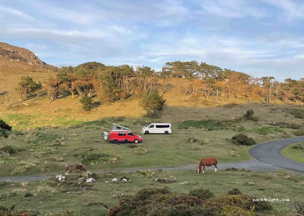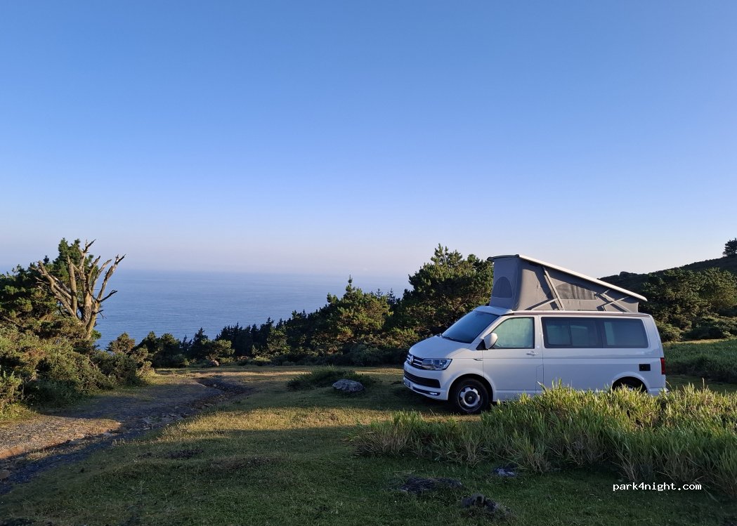 Eine Rasenfläche am Straßenrand (sehr wenig Verkehr), ein oder zwei Wohnmobile möglich, mitten in der Natur mit Blick auf das Meer. In der Nähe bietet der Aussichtspunkt der Limousine einen schönen Blick auf Carino und die ria d'Ortegueira.