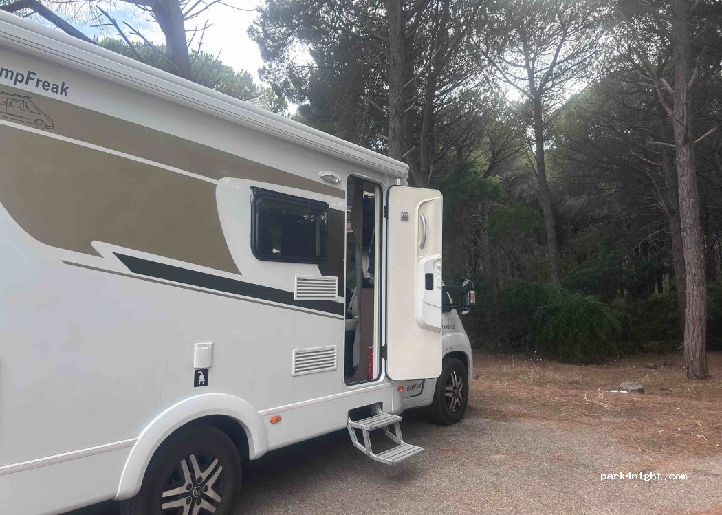 Hatten eine ruhige Nacht. Da es an der Straße liegt ist mit Verkehr zu rechnen, aber im Rahmen. Im Hintergrund ist ein Pinienwald und Wildschweine sind Nachts aktiv gewesen. In unmittelbarer Nähe ist ein Supermarkt, Bar und Restaurant. Für eine Nacht super!