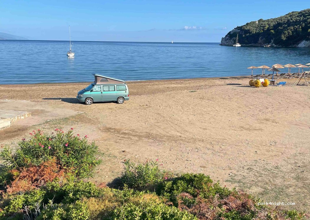Schöner Strand zum Parken für die Nacht. Haben ihn uns mit ein paar Segelbooten geteilt. Auch eine sehr schöne Taverne gleich ums Eck (Öffnungszeiten beachten).