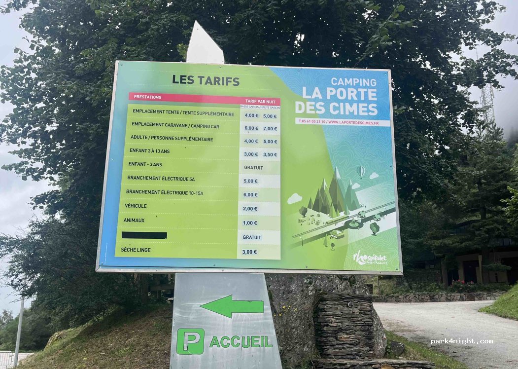 23 euros 2 adults 2 dogs 7.5 metre motorhome electric hook up great, toilets and washroom adequate, couldn’t find the waste for the motorhome toilet reception told me it was in the air in the village, also couldn’t find the tap to fill our water up, great clean stay surrounded by mountains went to 7c in the night July 1st lovely and hot in the day, great quiet site