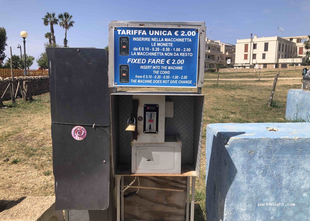 Parcheggio su terra molto comodo, al centro e al lungomare. A ottobre il prezzo é di soli 2 euro che si pagano all'ingresso . Si può tranquillamente pernottare ma i varchi del parcheggio vengono chiusi alle 20 e riaperti alle 8.