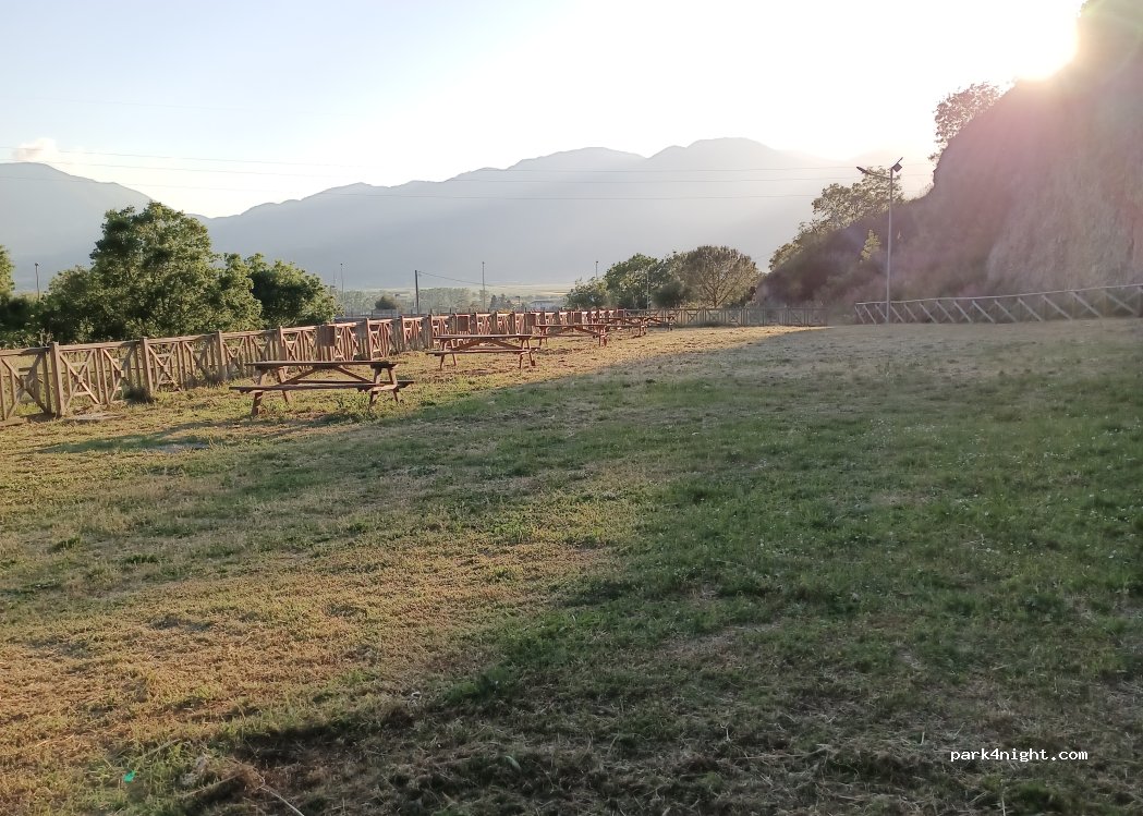 Area attrezzata con bagni, fontane e panche ombreggiate. Non ci ho dormito ma ci si può dormire bene, posti in piano e anche all’ ombra. Ci parte un sentiero per la falesia e per il paesino sopra (1,5 km)