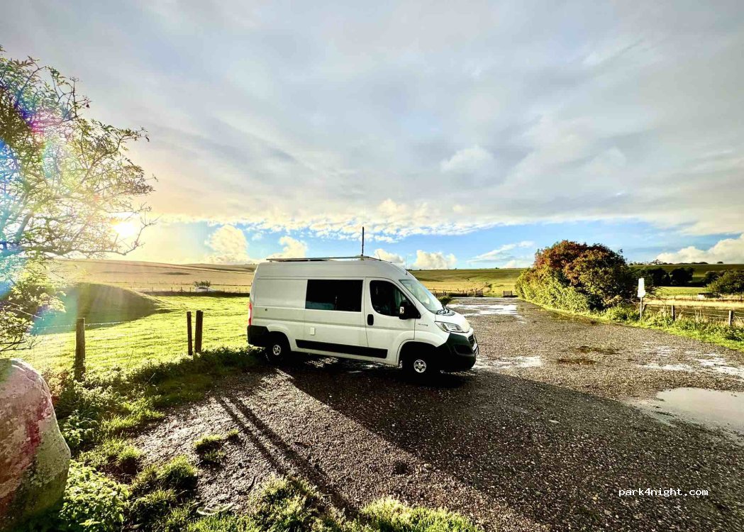 Nice park-up, fairly level, good location for short walks to nearby Long Barrow & White Horse. Quiet overnight, 5 other vans there. Minimal signal on Vodafone & EE.
