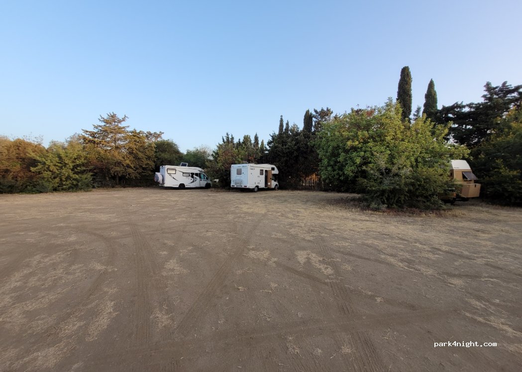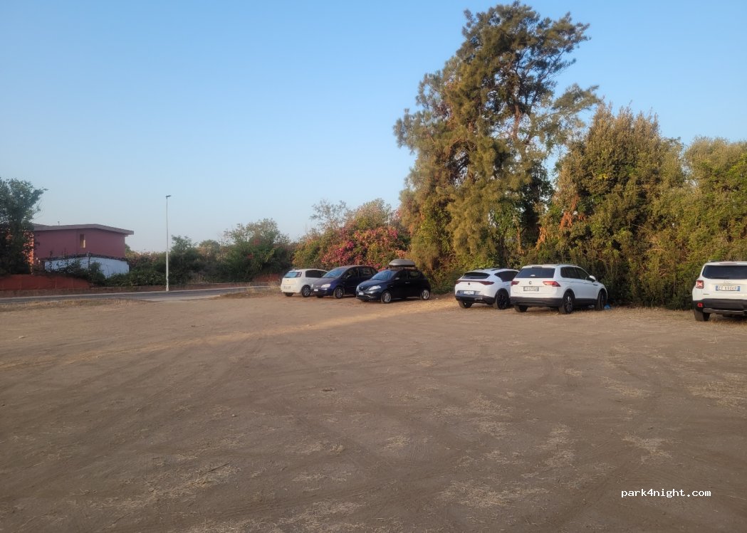 Large gravel parking lot in a quite area. We spent here many days alone in October when visiting Villasimus, safe parking, no issues. 5min walk to Simus beach and 20min walk to town and restaurants.