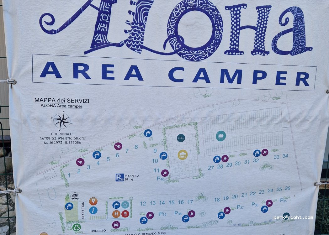 Area di sosta ALOHA a circa 2 km dal centro di Pietra Ligure ubicata in un ex vivaio. Ideale per un week end. 15€ al giorno. Proprietari molto disponibili e posto curato e pulito. Servizio navetta per il centro città o offrono bici in prestito. Rumorosa di giorno per il traffico della strada. Un po' rumorosa di notte per il passaggio dei treni in lontananza.