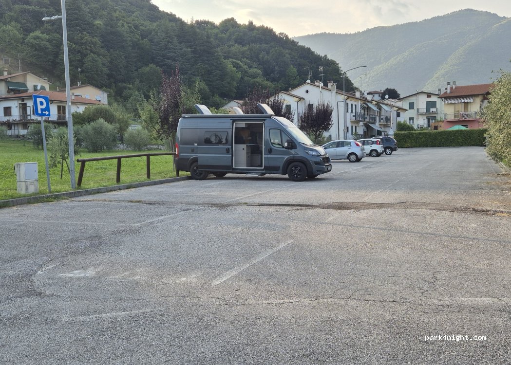 Free and quiet parking in the town center. Parking slightly sloping. In the vicinity there is a small garden with a swing. A few steps away are bars, tobacconists, post offices, ATMs, newsagents, ice cream parlors. Great to spend a night.