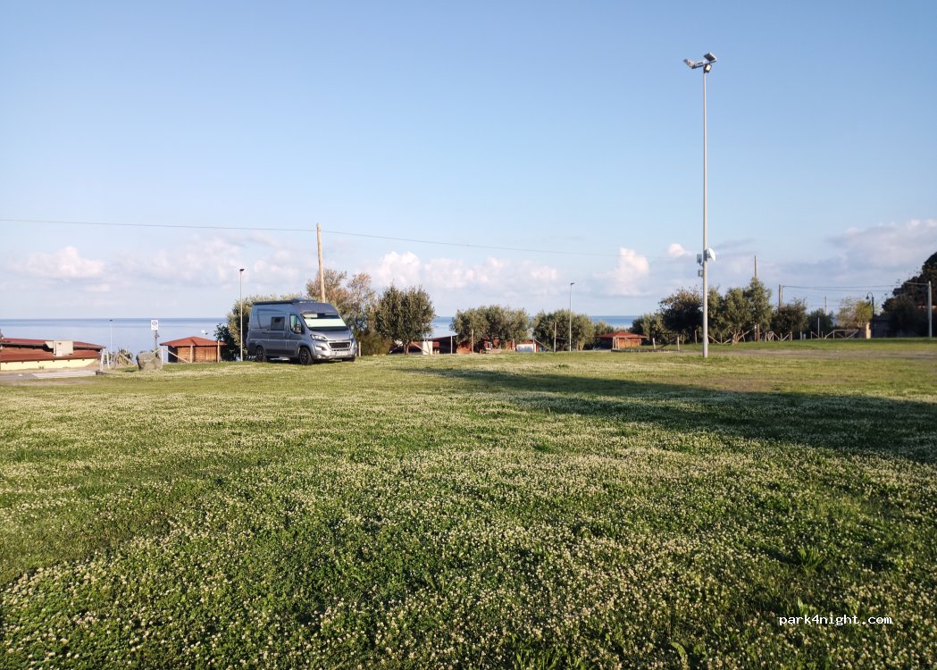 Ottimo parcheggio gratuito su prato non alberato, antistante zona pedonale con ristoranti e bar con terrazza sul mare. Ok pernotto, no campeggio. Enorme spiaggia sottostante semivuota anche in pieno agosto. Docce gratuite all'ingresso della spiaggia. Il mare è molto bello, peccato che compaiono enormi chiazze di scarichi per tutto il pomeriggio, cosa purtroppo già vista in altri lidi calabresi...
