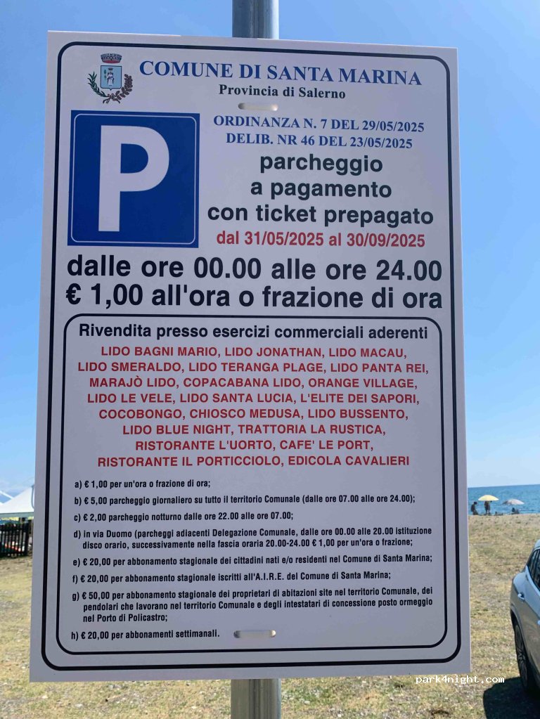 Attenzione: Comune AntiCamper! Nel periodo estivo è interdetta la permanenza di camper e roulotte SU TUTTO IL TERRITORIO COMUNALE di Santa Marina (quindi Policastro) dalle 20 alle 8. Nonostante fossi titolare di un abbonamento per la sosta valido per tutta la stagione (costo: 50€) sulla targa del camper, verso le 22 sono stato svegliato da ausiliari della sosta ed invitato ad andarmene.