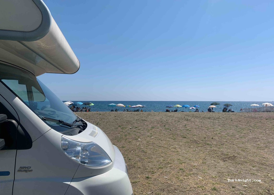 Diversi giganteschi parcheggi a pagamento di fronte al mare e alla fine una spiaggia di ciottoli. Superficie del terreno: erba + ciottoli, non penso che possiamo impantanarci.