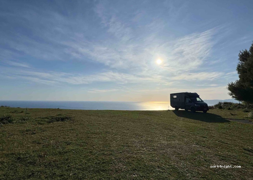 Es ist unglaublicher Stellplatz auf einer grünen Wiese mit einem fantastischen Ausblick aufs Meer und die untergehende Sonne.