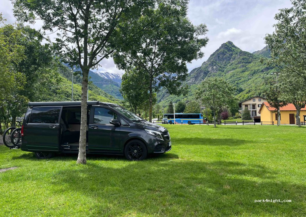 Aire de camping-car au bord de la rivière, sur herbe. Belle vue sur la montagne.