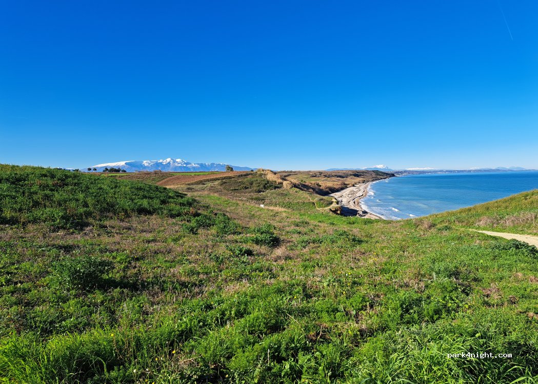 Parcheggio gratuito in piano. Poca ombra, ma ben ventilato. No servizi e no camping, ma c'è una fontanella.Quando ci siamo fermati noi c erano altri 4 camper. Di giorno è un normale parcheggio per la spiaggia e quindi affollato di auto, ma la sera si svuota. La notte si sono susseguiti botti per la dissuasone di uccelli. Con una passeggiata di 5 minuti si possono raggiungere due spiagge di sassi.