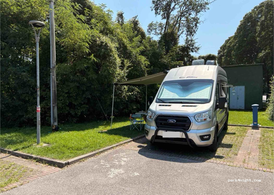 Area di sosta comodissima, ad un tiro di schioppo da piazza Duomo, pizzeria (buona ed economica) a meno di 5 minuti a piedi. Carico, scarico ed elettricità a 5€ per 24 ore. Consiglio di andare all’info point e prenotare una visita guidata (gratuita) alla città, peraltro molto carina. Niente quinta stella perché il pagamento è solo con monetine (nonostante sia presente il card reader, disattivato).