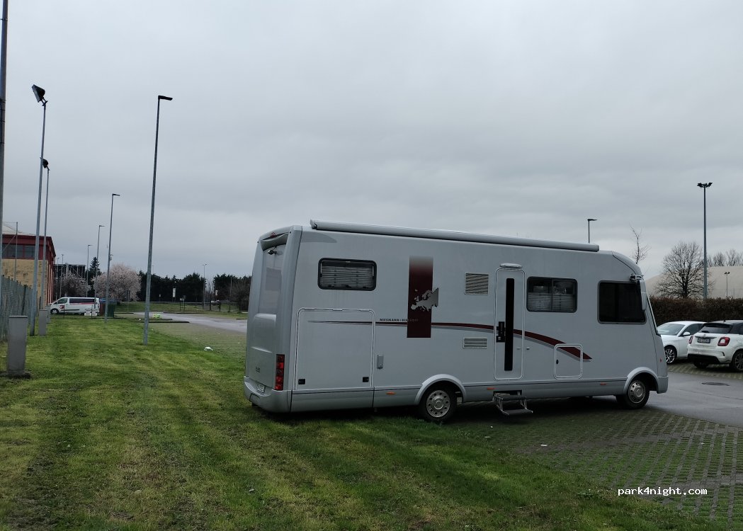 Kostenloser Parkplatz direkt an einer stark befahrenen Straße. Nachts ruhig. Für eine Nacht ok.