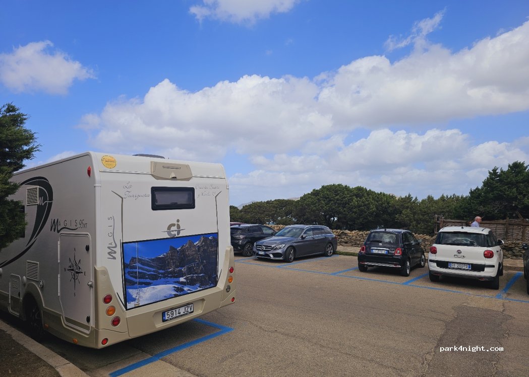 En mars, nous étions seuls ! Le stationnement est gratuit hors saison et les places sont larges et profondes. Très facile d'accès pour notre gros camping car. Accès direct à la plage ! Ce spot offre une belle vue sur la Pelosa. Pas de service.