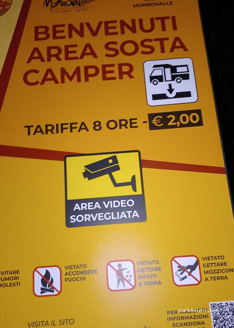 Prima cosa arrivati a Morrovalle non ascoltare il navigatore che la segnala a sx in area pedonale ma proseguire pochi metri e trovate il cartello che segnala l'area. I servizi come descritti da altri utenti con lo scarico servito anche da getti di pulizia. Oltre tutto il resto aggiungo che Morrovalle è molto bella e vale la pena visitarla!!!
