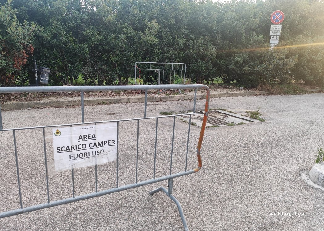 Scarico grigie e nere gratuito, griglia autopulente. Carico acqua a pagamento. Facilmente accessibile, proprio in un grande parcheggio gratuito di fianco al parco urbano di Forlì.