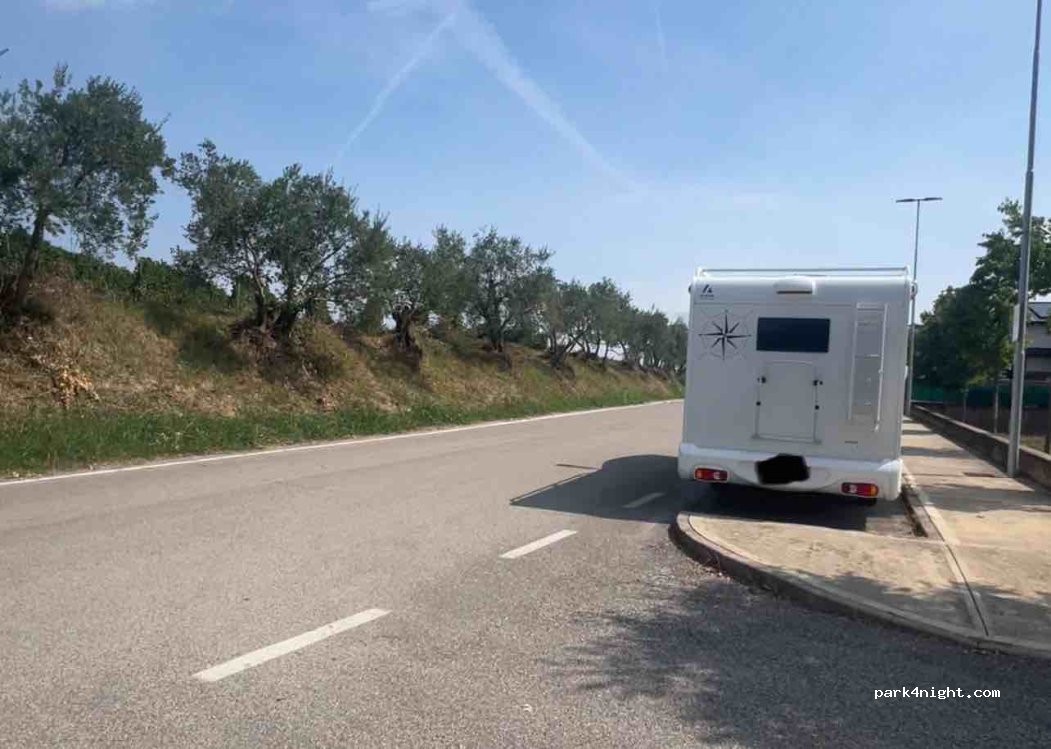 Muy tranquilo, la ubicación no es la correcta (45.4392893, 10.6752311) pero está justo en frente del “Bertoletta village apartments”. El parking es grande, no hay limite de altura, hay arboles pero no dan mucha sombra porque aún son pequeños. El suelo es plano de hierva y grava. Caben mas de 20 vehículos. Hay un pequeño parque para niños y una zona de paseo.