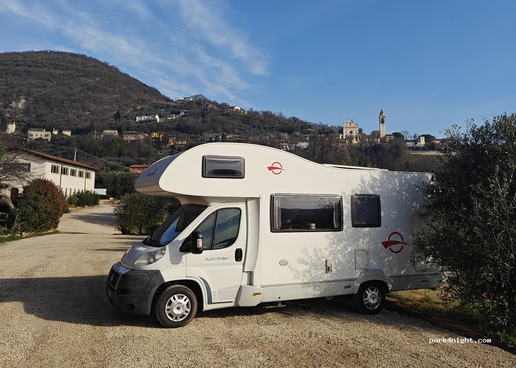 Sehr schöner Stellplatz mir Aussicht aufs Weinfeld. Ab dem späten Nachmittag ist auch Schatten vorhanden. Wasser und Toiletten verfügbar. Im Weingut wurde uns eine Weinprobe angeboten.Die Gastgeberin hätte uns sogar eine kalte Platte mit Aufschnitt für den Abend gemacht. In der Umgebung kann man toll wandern. Infos gibt's im Ort Barbarano Vicentino in der Touriinfo.