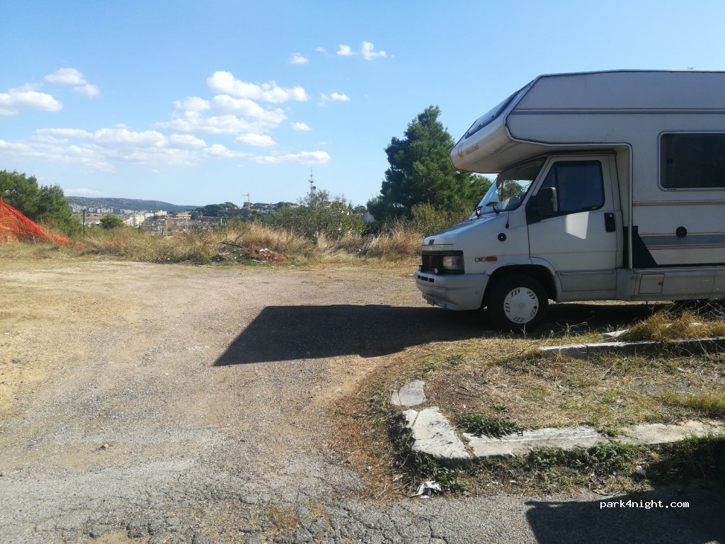Emplacement parfait pour profiter de la ville jusque tard et dormir sur place. Belle vue sur la ville. La route est à proximité mais pas très fréquenté (mars). La nuit fut calme et secure Le sol n'est pas parfaitement plat mais on trouve à équilibrer