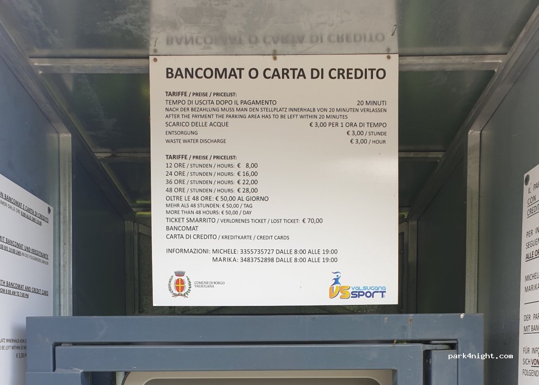 Schöner Stellplatz, alles grün, ausreichend Platz. Nachts sehr still, man hört sogar die Brenta! 1 Tag 16 €, 2 Tage 28 €, aber Vorsicht ab 48 Stunden wird es teuer: 50 € pro Tag! Service und Strom im Preis und alles funktionabel und ordentlich. Kommen gerne wieder.