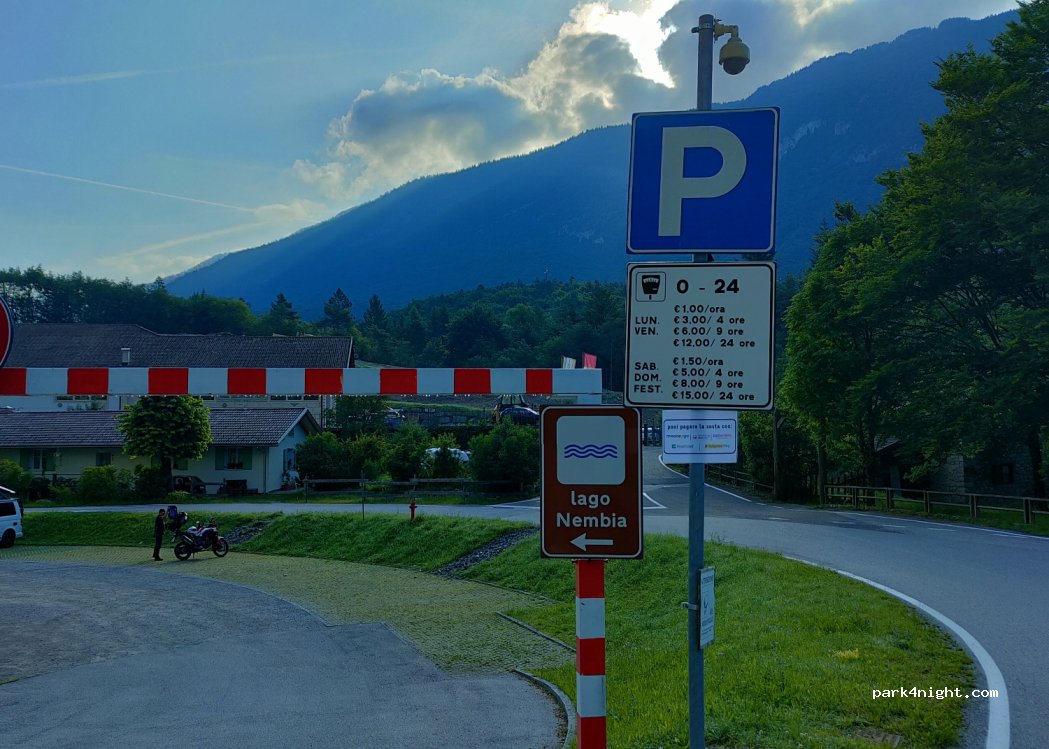 Parkplatz am See (Lago di Nembia) - keine Aussicht auf den See. Am Ufer gibts Liegewiesen, Stege, Spielplatz, Mülleimer und einen Brunnen. Hier gibt es drei Parkplätze, zwei mit Höhenbegrenzung auf 2,5m. Für höhere Fahrzeuge ist es möglich entlang der Strasse zu parken. Kostenfrei zwischen 9 und 18Uhr. Ausserhalb muss eine günstige Parkgebühr verrichtet werden.