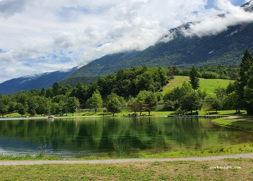 Aparcamiento en el lago (Lago di Nembia) - sin vistas al lago. Hay prados soleados, muelles y un parque infantil en la orilla.
