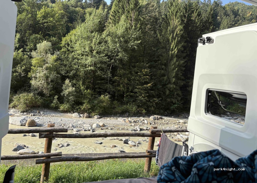 superbe endroit où nous avons dormi 2 nuits, aire de jeux pour les enfants avec tables de pic nic et barbecue. la rivière en contre bas, accessible et une jolie vue sur les montagnes. l'aire est équipée d'une douche avec de l'eau chaude et d'un toilette.manque pour accrocher sa serviette et un verrou pour pouvoir fermer quand on prend sa douche. petit bémol nous n'avons pas réussi à payer par cb