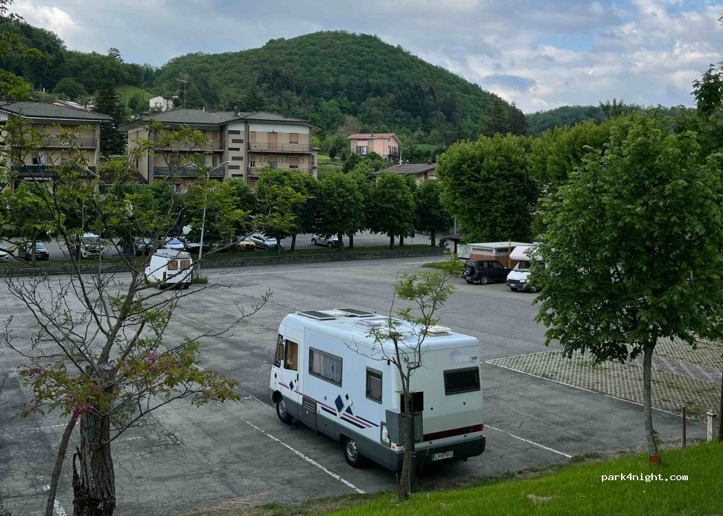 Nice parking place and small cute city! Stefano didn't answer on the phone, so stayed there for free with no electricity, sloping parking had to use wedges.