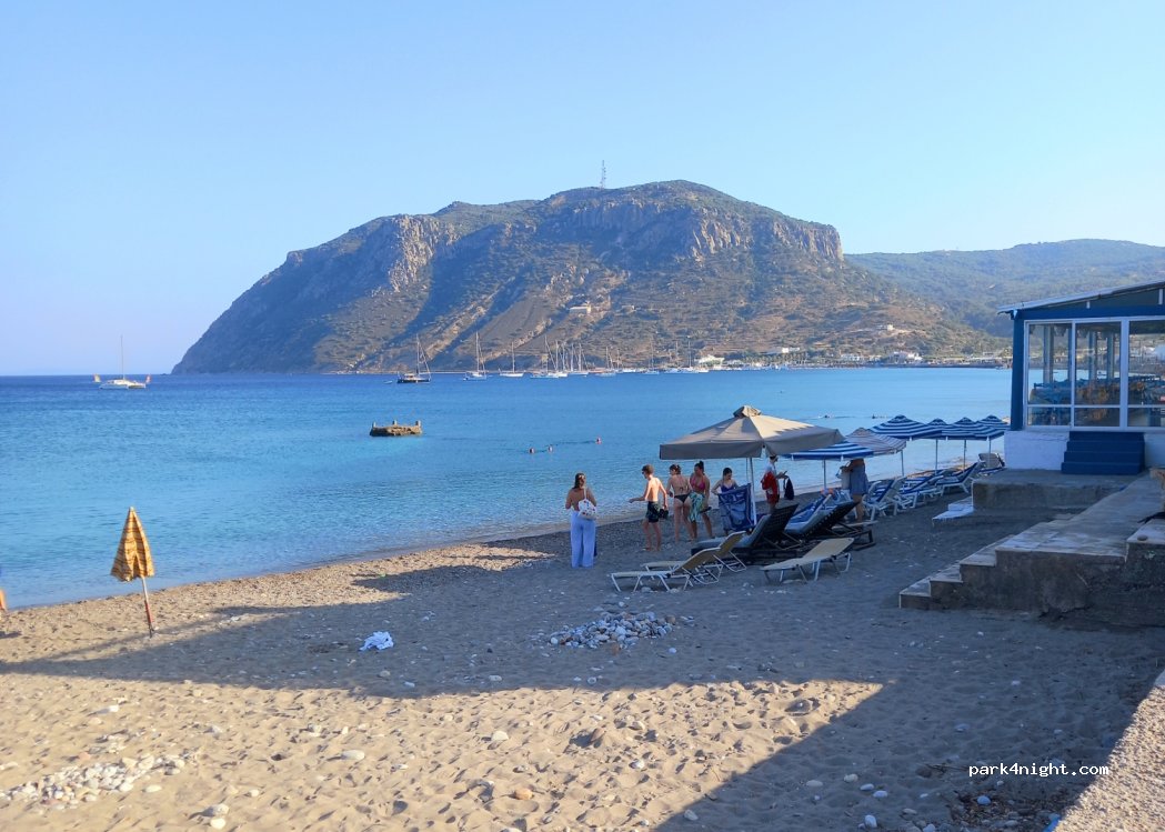 grande piazzale asfaltato dove posteggiano i bus , spiaggia con doccia , mare un po freddo forse perché arriva del' acqua dolce dal sottosuolo. Notte tranquilla senza traffico ,taverne vicino