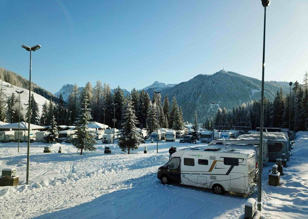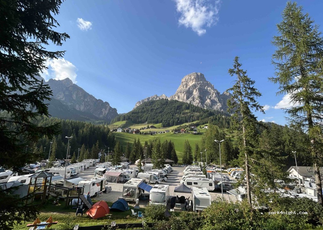 Unica possibilita di sosta notturna a Colfosco. Particolarmente caro 2 pers e csmper oltre 40€ Si deve uscire entro le 11 per non pagare una altra giornata. Se pissibile andare altrove.