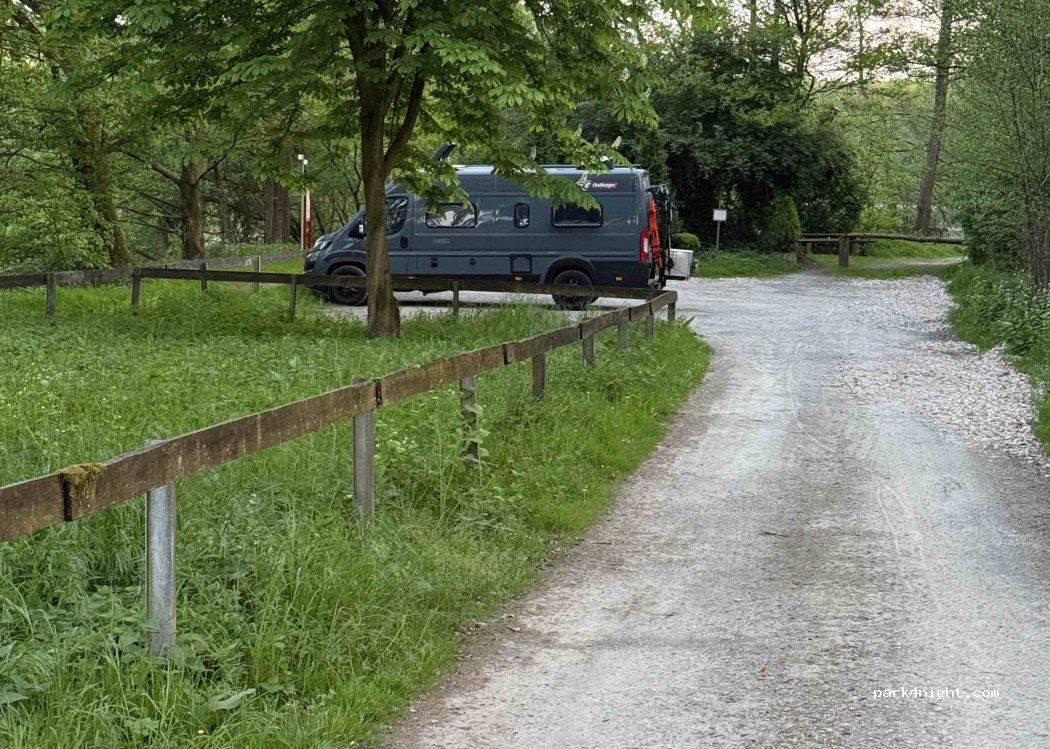 Small parking lot, not suitable for mobile homes, but ideal for a VAN for one night, you can hear the road but don't bother. Small fishing lake with tour. And lots of seating.