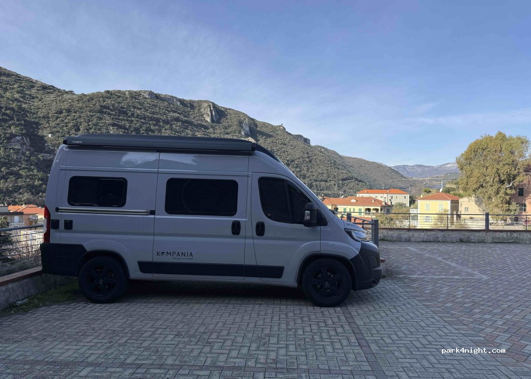 La Villetta car park. Unguarded parking, for a fee, between Finale and Final Borgo. Quiet area with little traffic. Not recommended for large campers, I would say a maximum of 6m like ours.