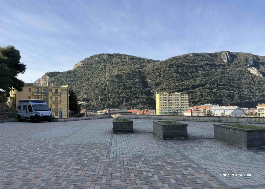 Auf der oberen Ebene eines Parkhauses. Ab 0,30 €/Stunde. Am Wochenende und in der Saison ab Juni teurer. Ausschließlich für Vans in der 6 Meter Klasse geeignet. Etwa 12 Minuten nach Final Marina, und 17 Minuten nach Finalborgho. Keinerlei Campingverhalten möglich