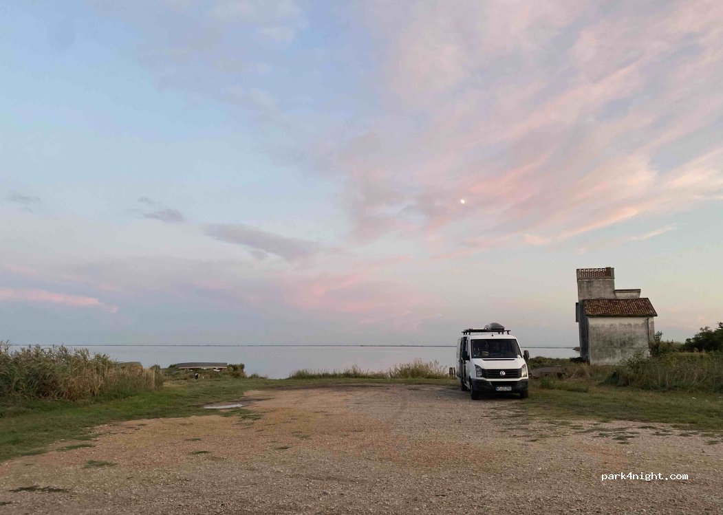 A muddy sandy parking at the fisherman’s pier. Nice view at the morning, at 4 O’clock in the morning come fishermen/hunters, that go for a daily fishing/hunting. There are also flamingos at the sunrise. They come back at about 9 O’ clock. Otherwise a good place to overnight. You can go for a walk/trip along embankment. There are also herons.
