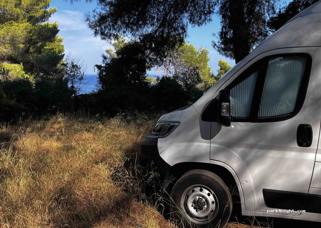 Très bel endroit pour passer la nuit. Le gardien fait son possible pour donner des informations en français et en anglais. Jolie pinède avec vue sur la mer et un petit château. Accès à la plage par un sentier. Attention vous devez remporter votre poubelle. C'est le même parking que celui proposé 15 via panoramique sur le site.