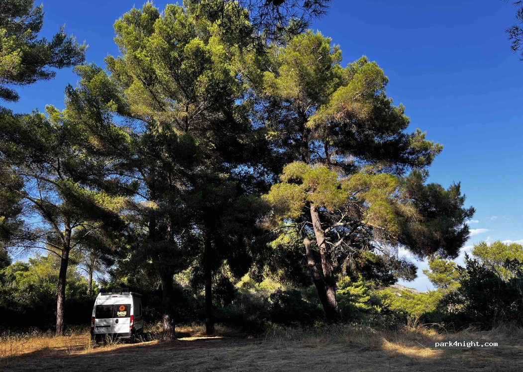 Schöner schattiger Parkplatz mit freier Platzwahl im Pinienwald. Standen noch mit 2 weiteren Campern und blieben für 2 Nächte. Sehr ruhig. 15€ für Tag/Nacht. Ist nur tagsüber bewacht. Fühlten uns sehr sicher. 5 min zum Strand (steinig Bade Schuhe zu empfehlen). Leider nicht mal eine Müllentsorgung daher 1 stern Abzug.