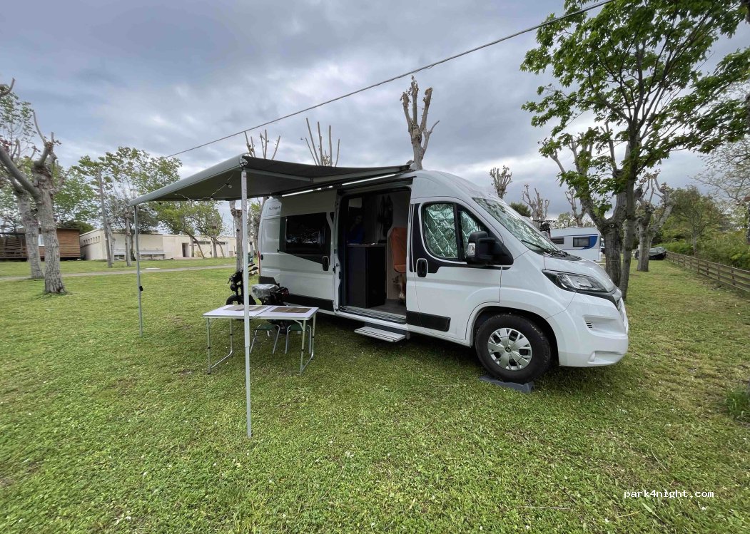 Resté une nuit car rien d autre ouvert là. Terrain pentu, cales insuffisantes pour rétablir l horizontal. Sanitaires délabrés, beaucoup hors d usage. Beaucoup de places disponibles mais le gérant a voulu placer un autre camper juste collé au nôtre. 27€/nuit pour un van, 2 personnes, électricité est exagéré. Douche payante. Seul point positif, le gérant nous a recherché un restaurant pour le soir.