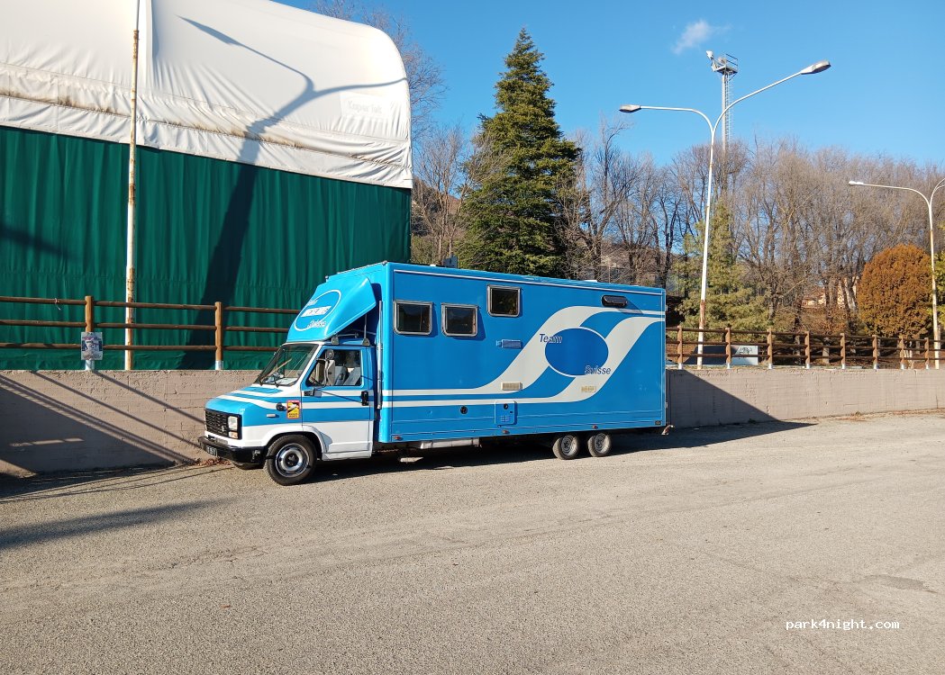 In winter the water point is shut off (including at the neighboring caravan service area). The place is large but only quiet during the night - from early morning until around 23h it is a non-stop hustle of activity, including the constant screams, grunts, and shouting of people playing squash and kids at the skatepark only meters away. Feels safe, but extremely noisy, even by Italian standards...