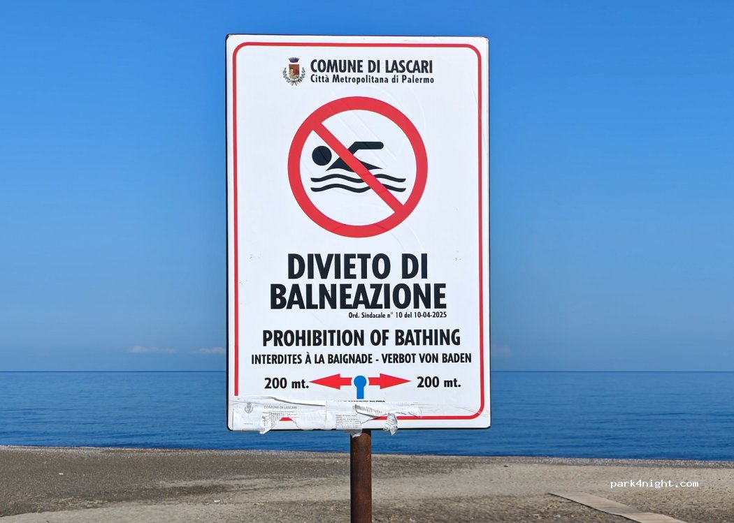 Neues Camping verboten Schild. Wurden in der ganzen Gegend überall neu angebracht. In dieser Gegend will man uns nicht. Am besten überspringen. Sizilien hat eh viel schönere Gegenden zu bieten als diese hier.