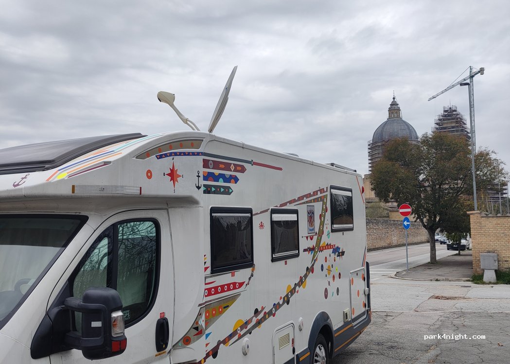 Accanto alla basilica. Ottimo per una visita alla Porziuncola. Nulla di più che un parcheggio e il camper da 7m e 40 c'è stato per miracolo. Non ci siamo fermati per la notte perché non amiamo le soste libere lungo le strade.