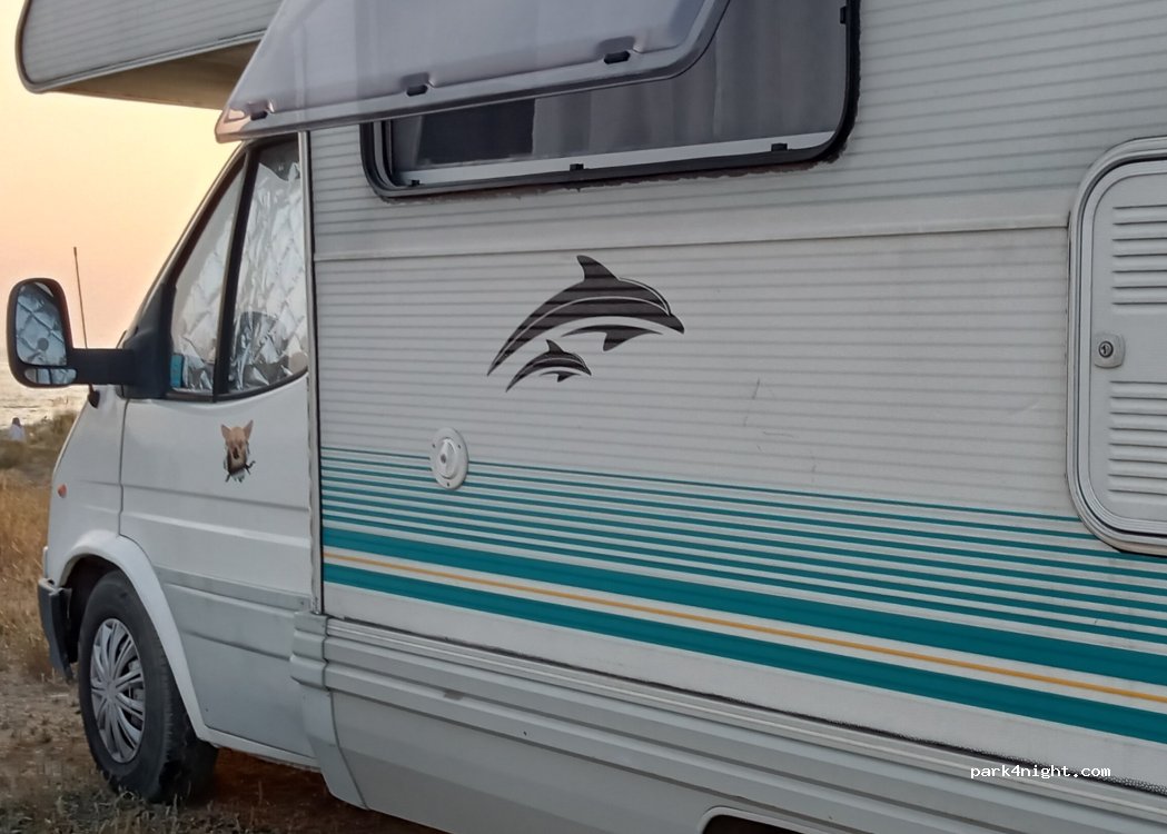 Angenehmer Vorsaison-Stellplatz. Großer ebener Schotter-Parkplatz bis Juni kostenfrei. Außer Restaurant-Gäste und ein Wohnmobil eines Angestellten nur ein Camper. Direkter Aufgang zum Meer. Autark eine Nacht einwandfrei, ansonsten nicht sehr einladend.