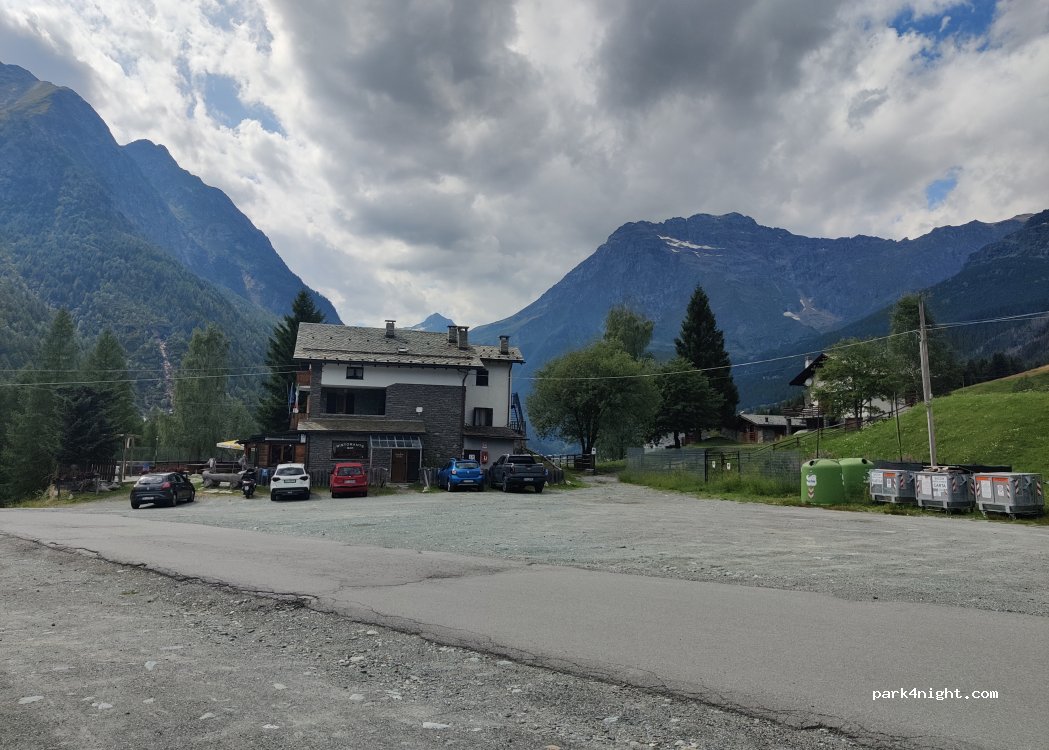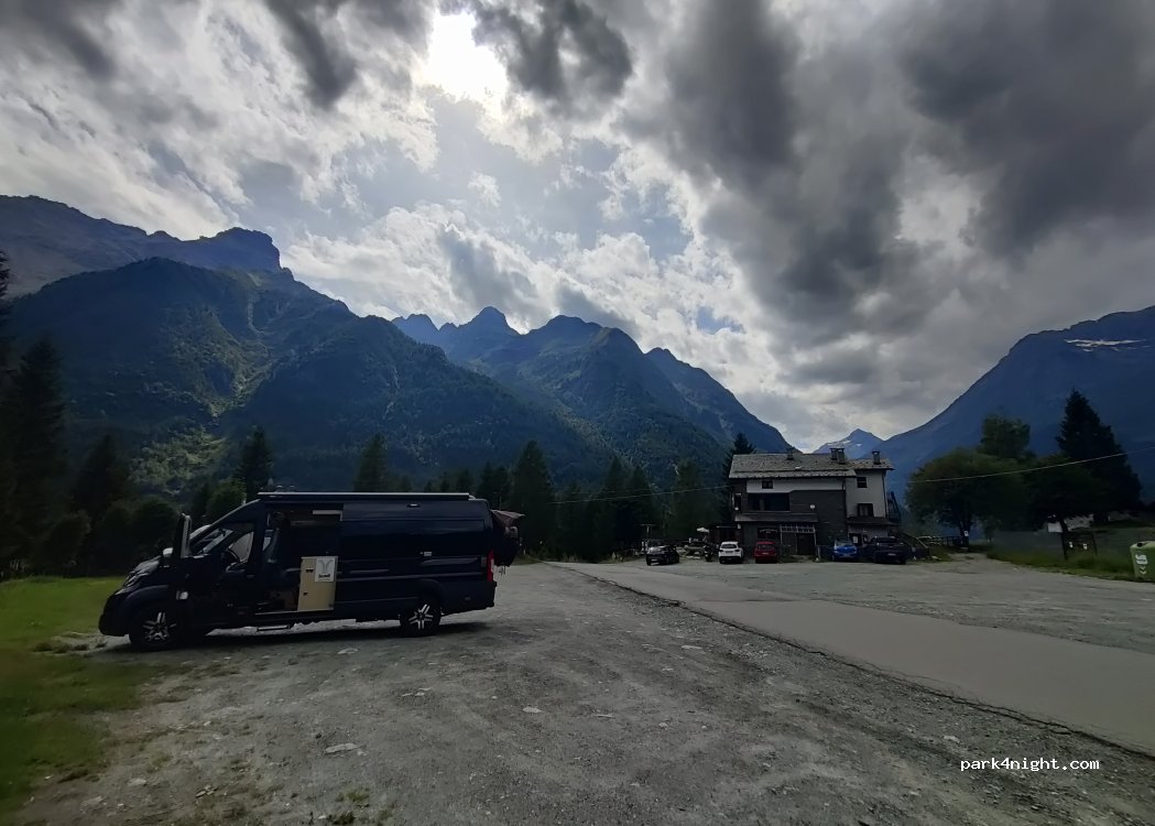 No longer free. Payment between 0800 and 2000. Not sure if there is a day cost but we stayed a couple of hours for a lovely walk. 66c/hr. Road narrows after this point and many twists to here from Chiesa. Not for the faint hearted!