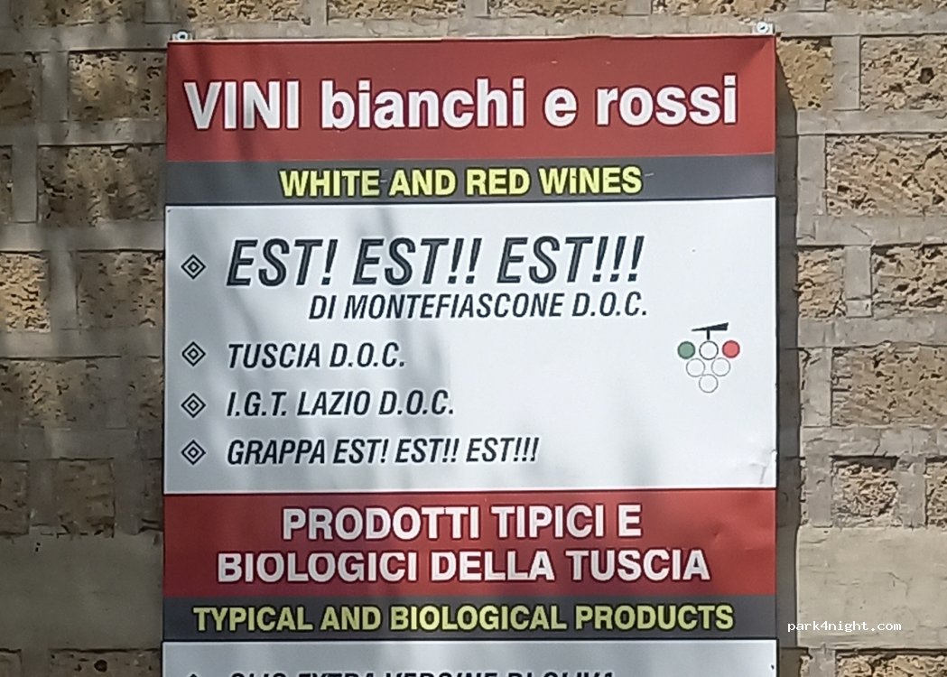 Pratico per passare una notte e per visitare il paese. servizi di acqua scarico e corrente gratutiti. Ci sono dei mezzi che stazionano fissi e che danno l'idea della presenza di "stanziali" nel parcheggio. Se si arriva di notte non si vede bene l'ingresso, cercate il cartello "Est Est Est" o l'insegna grande "Non solo Vino".