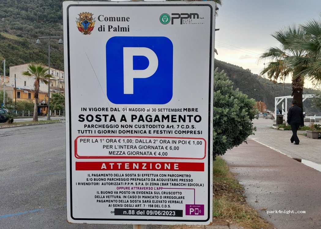 Abbiamo sostato per una notte nel periodo di marzo “bassa stagione” per giusto a pagamento perché strisce blu ma noi abbiamo sostato gratuitamente nessun controllo dai vigili visto il periodo. Parcheggi illuminati vista stupenda sullo scoglio dell’Ulivo strada trafficata ma siamo stati tranquilli..