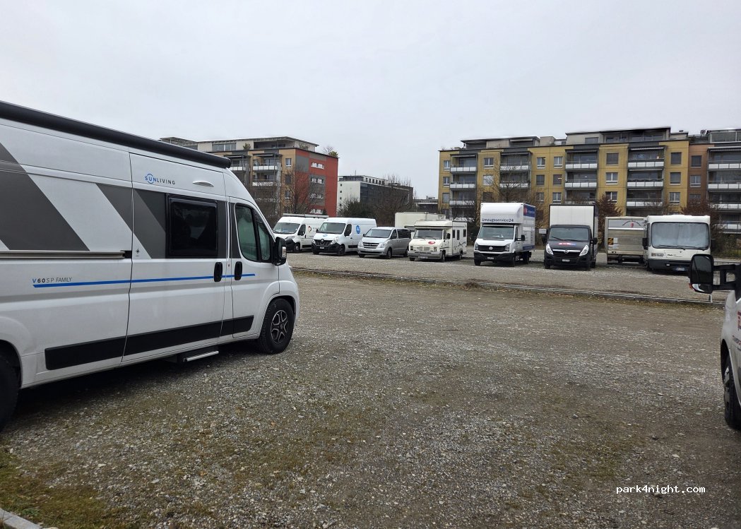Muy cómodo!! A 10-15 minutos en coche del centro. De pago solo a partir de las 7h, pasamos la noche sin problema ni restricción, algo a valorar aquí en Suiza. Algo de ruido de furgonetas a primer hora. Sin baño y ni fuente. Wifi gratis!!
