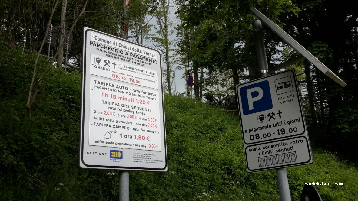 Piazzale per camper in basso, tariffa giornaliera 10 e, divieto di parcheggio su tutti i piazzali nelle ore notturne ma in questo periodo tollerato, perfetto per visitare il santuario, poca linea telefonica e niente internet